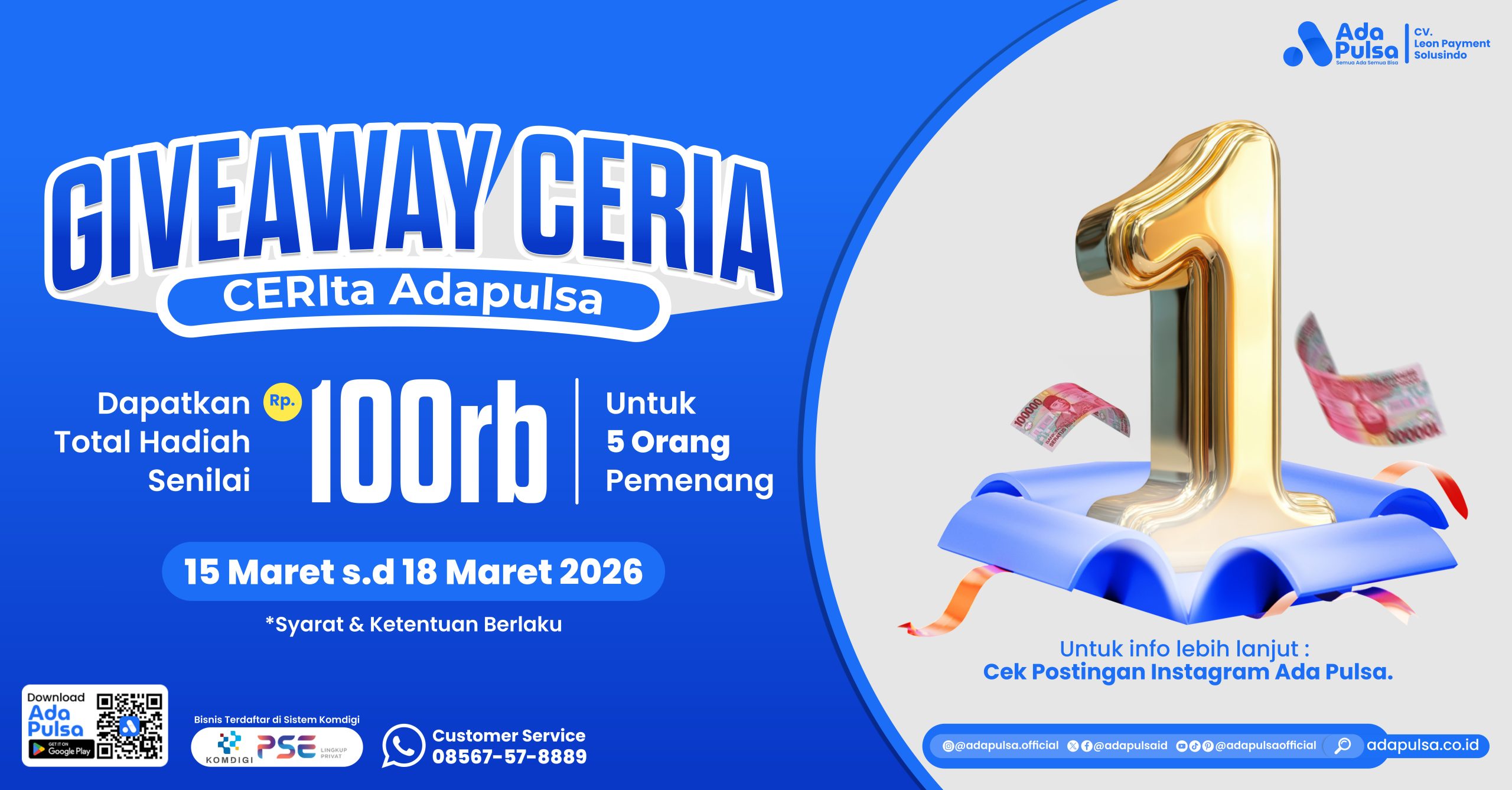 Dalam rangka merayakan ulang tahun ke-1 Ada Pulsa, kami ingin berbagi kebahagiaan bersama kalian semua. Oleh karena itu di momen spesial ini, kami ingin memberikan apresiasi berupa Giveaway saldo gratis total Rp100.000 untuk 5 orang pemenang yang beruntung.